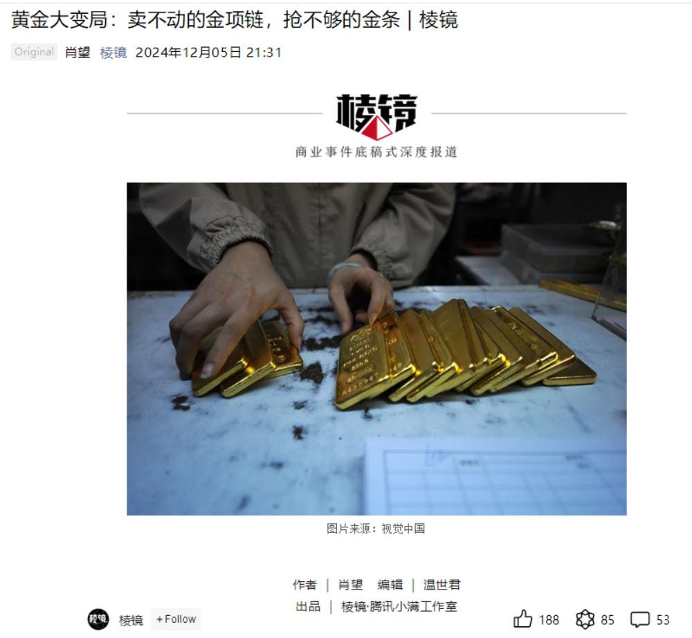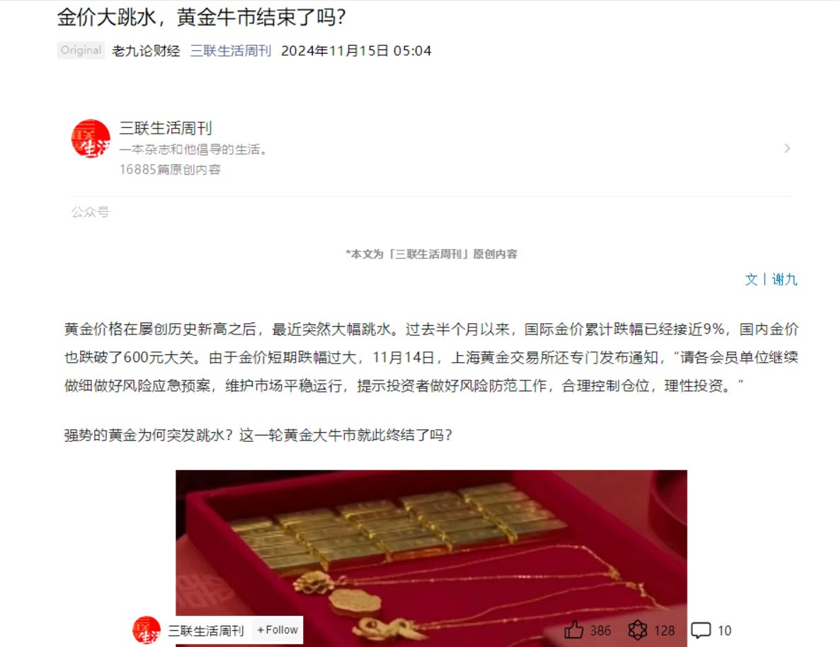 Following the US election, gold fell a bit from its rally. However, it has rebounded a little and China restarted its buying spree at the end of last week. Let’s check out some of the most popular WeChat articles on the topic of Gold from the past month.